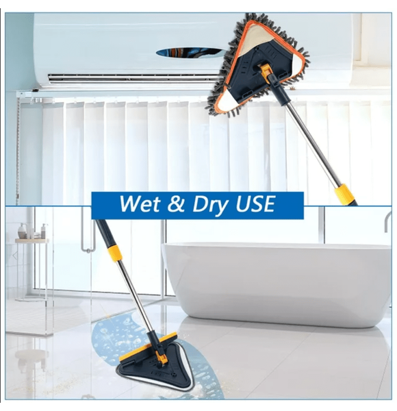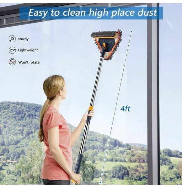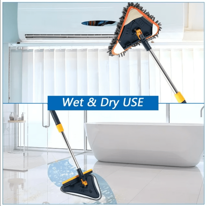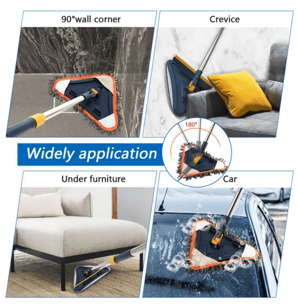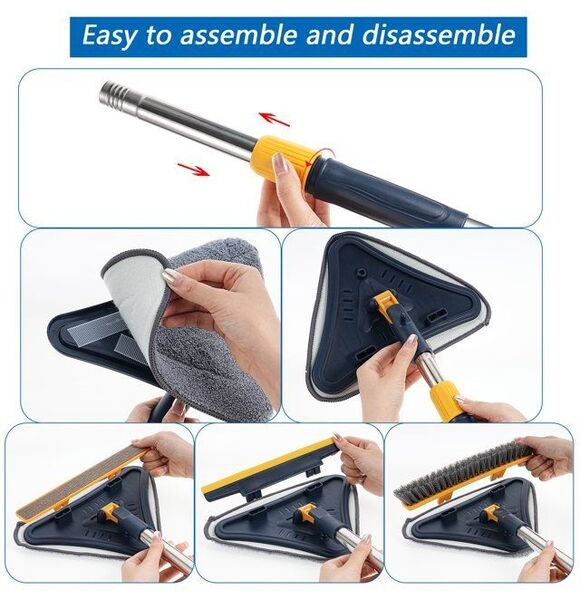 Features Lightweight yet stong metal extension rods, Wet Use Microfiber Mop Pads for Windows, Walls and Floors, Dry Use Chenille Mop Pads for Dust, Ceiling Fans, Furniture, Silicon Squeegee for Window & Glass, 180° Rotating Mop Head, Lock&Unlock the rotation, Hangable Design, Triangle Design for Better Cleaning the Corner.