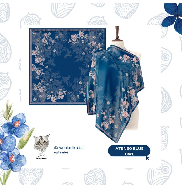 The Ateneo Blue Owl Sweet Miko Tudung measures 115 cm by 115 cm and is accompanied by an elegant and minimalist pouch.