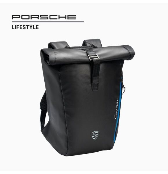 Porsche Lifestyle roll-up backpack: smart design for on the go. Made of tarpaulin material with 3D Cayman branding.