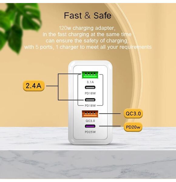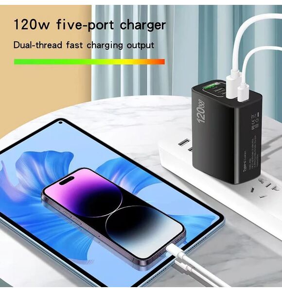 120W Fast Charging Multi 5 Ports USB C PD Interface Charger Quick Charge Phone Charger for Handphone.