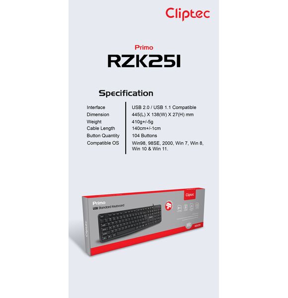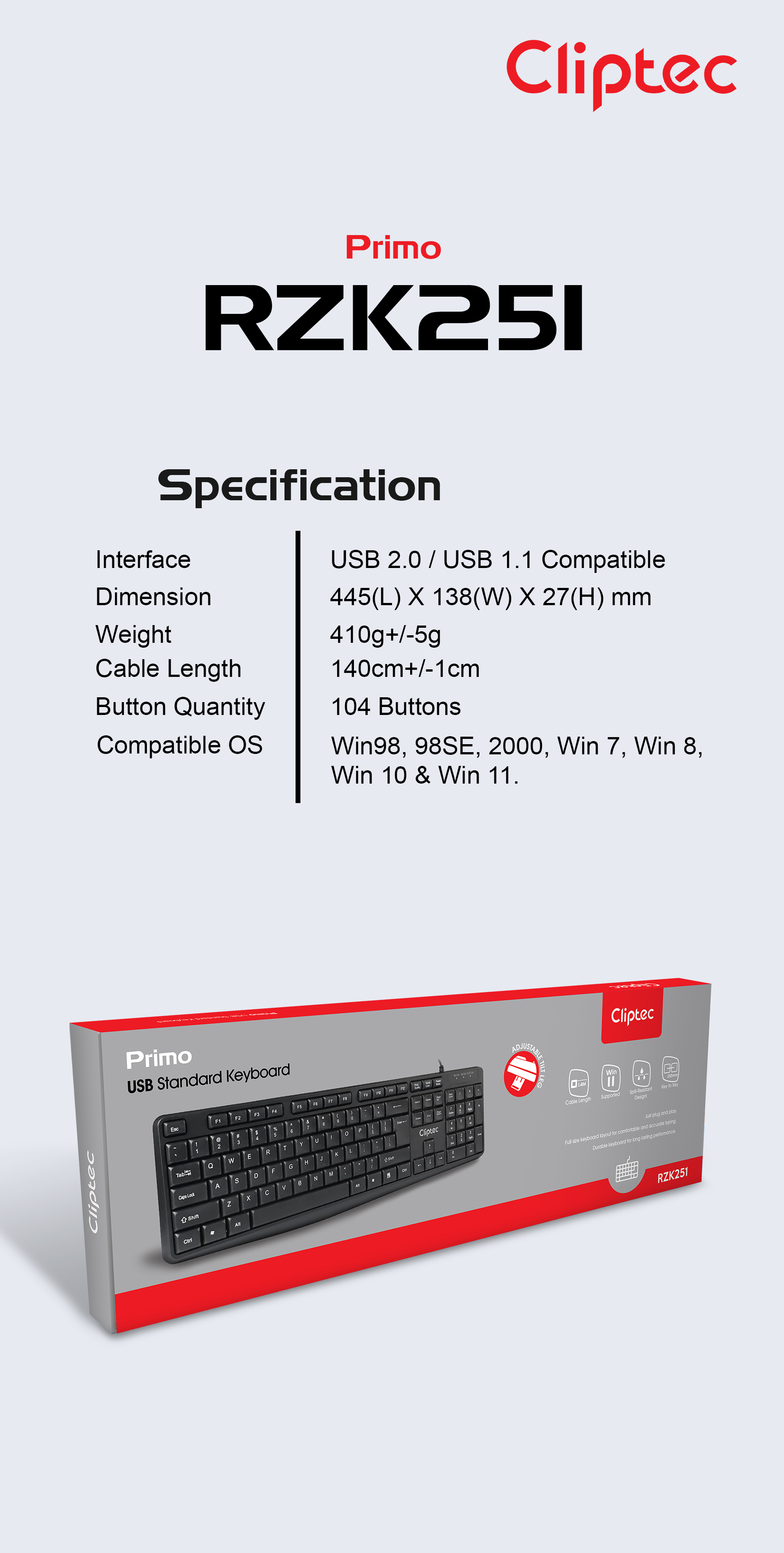 CLiPtec RZK251 USB Standard Keyboard-Primo is a standard 104-keyslayout keyboard,builtwith USB plug’n’play interface and compact-slim design and also provides low profle keys with comfortable stroke for a great typing experience and extremely comfortableand contains a20mm key pitch.CLiPtec RZK251 is designed for all your daily home and office applications need and enabled the complete functionality of the computer system.