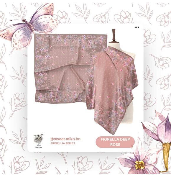 The Fiorella Deep Rose Sweet Miko Tudung measures 115 cm by 115 cm and is accompanied by an elegant and minimalist pouch, exclusive pin and hang tag.
