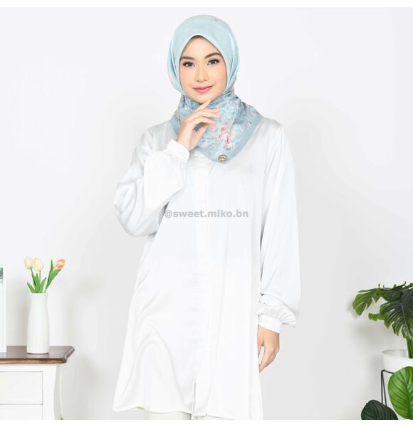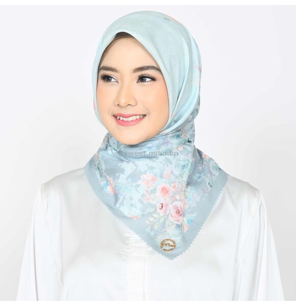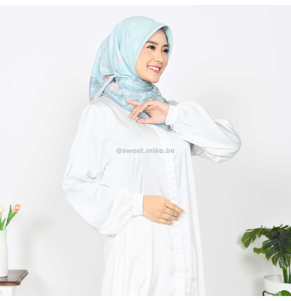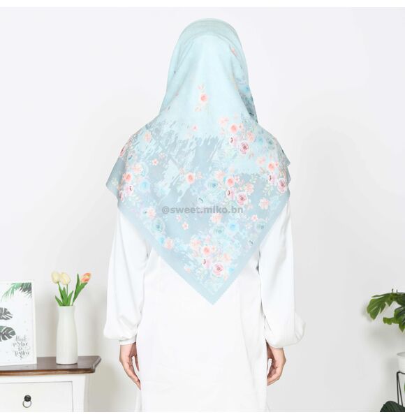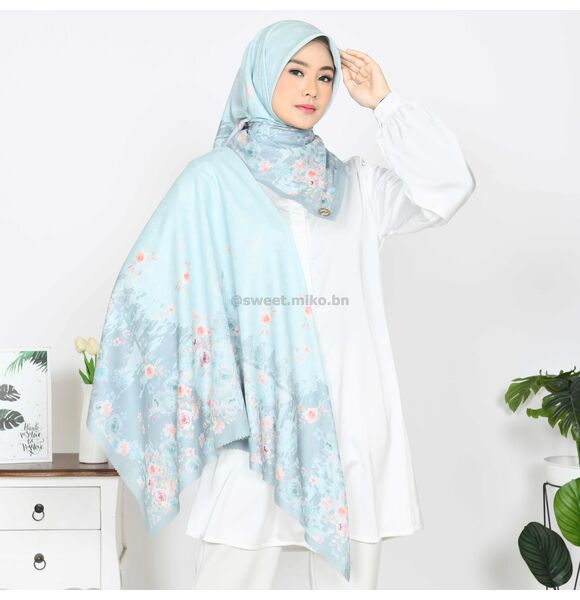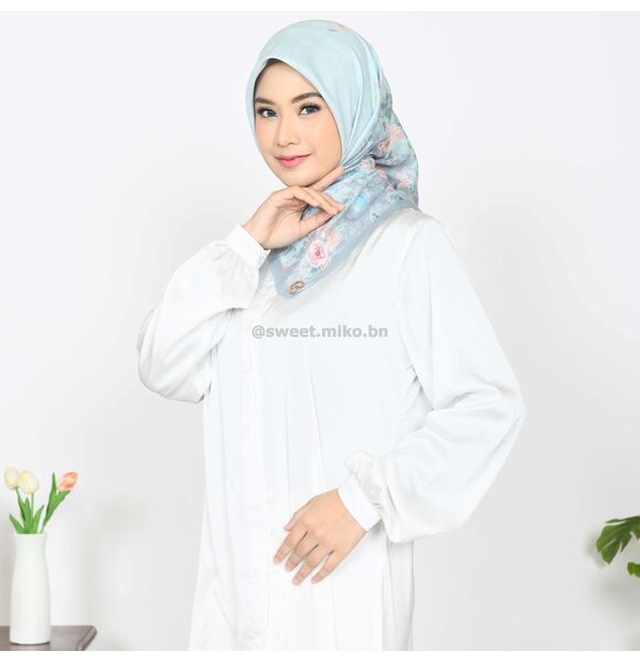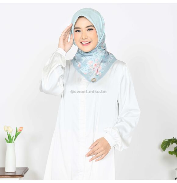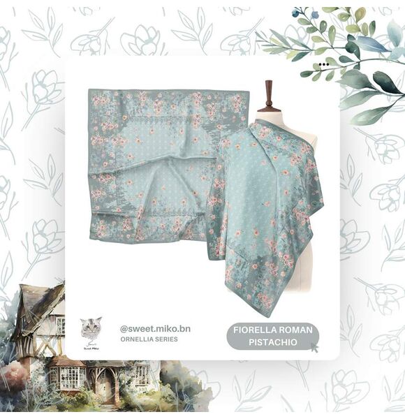 The Fiorella Pistachio Sweet Miko Tudung measures 115 cm by 115 cm and is accompanied by an elegant and minimalist pouch, exclusive pin and hang tag.