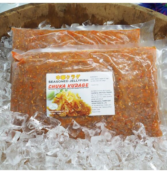 Frozen seasoned jellyfish is jellyfish that has been cooked, seasoned, and then frozen to preserve its flavor and texture. Often used in salads, appetizers, or as a side dish.