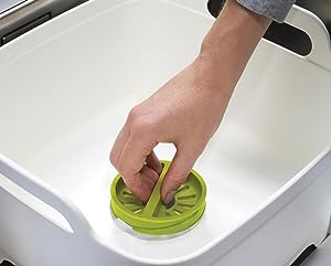 The clever integrated plug acts as a way to drain water away once the dishes have been washed, without having to lift a heavy water-filled basin. The plus can also be used as a strainer to trap any food particles, making it easier for them to be disposed of.