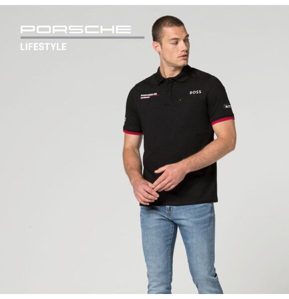 Based on the original Porsche Motorsport teamwear: Casual polo shirt with "PORSCHE MOTORSPORT" signet and "PORSCHE" logo on the shoulder yoke.