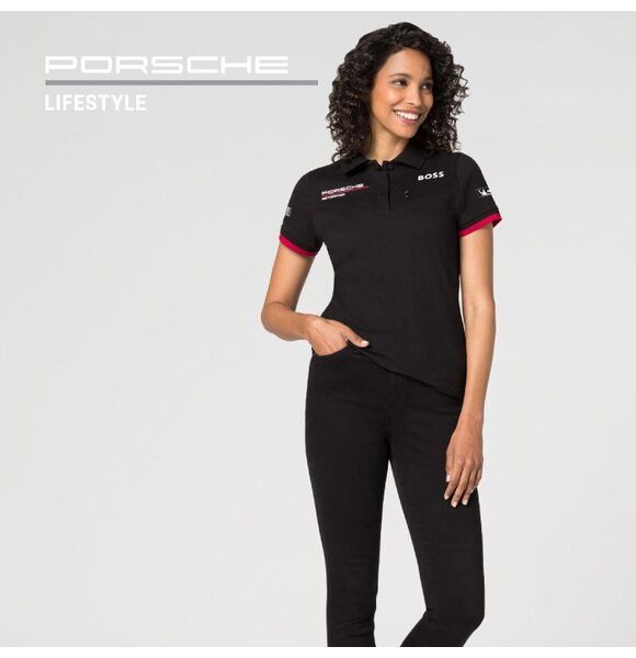 Based on the original Porsche Motorsport teamwear: Casual polo shirt with "PORSCHE MOTORSPORT" signet and "PORSCHE" logo on the shoulder yoke.