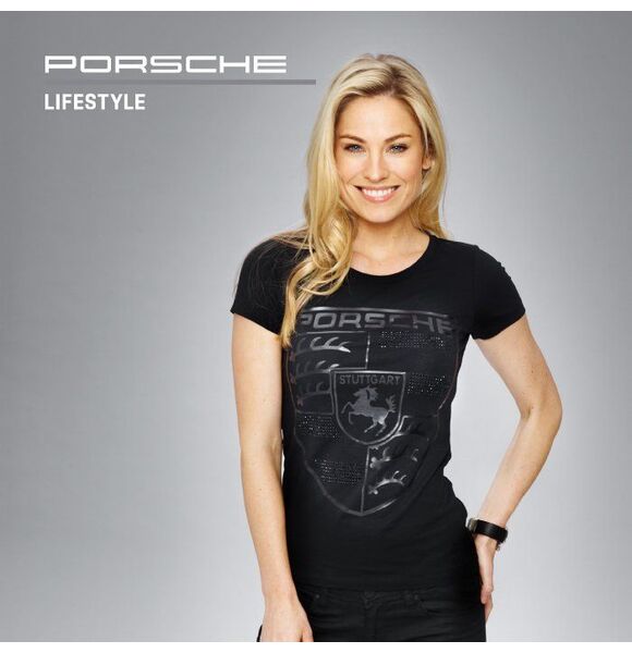 Porsche Crest is trimmed with black rhinestones. 95% cotton, 5% elastane. In black.