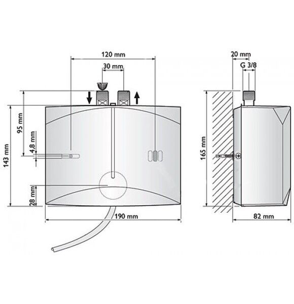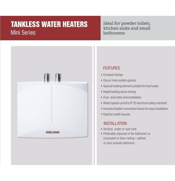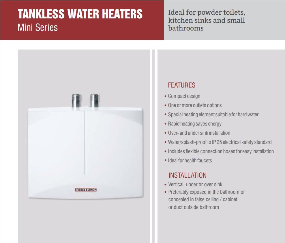 Stiebel Eltron DHM6 (German Technology) Size:Height 143 mm X Width 190 mm X Depth 82 mm PRODUCT FEATURES Elect. safety system with temp. cut‧off device For pressure-tested installation with pressure-tested taps For hard and soft water Hoseproof to IP25 360° Flexible Installation No standby or distribution losses Control unit: Hydraulically controlled Unit type: Centralized Heating system: Bare wire heating system SPECIFICATIONS Starting volume: ≧1.8L/min Power (220V): 6 kW Working pressure: 10 Bar Starting volume: ≧3.2L Inlet size: 15mm (G1/2″) Weight: 1.4kg Dimensions (HxWxD) mm: 143 x 190 x 82 Required 32A MCB 4mm Wiring safety
