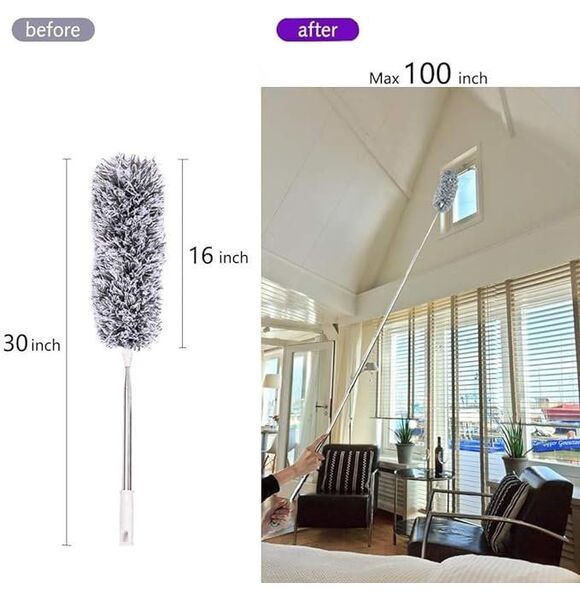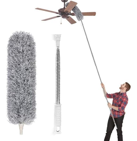 - CAN REACH HIGH CEILINGS: This telescoping microfiber duster with a extra long pole, can reach 100 inches when fully extended, easy to clean ceilings,cobwebs,walls, ceiling fans, and lamps. No more chairs or dangerous ladders to climb on.