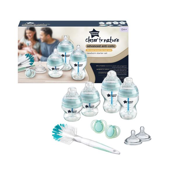 2 x 150ml Advanced Anti-Colic baby bottles with Advanced Anti-Colic slow flow teats 2 X 260ml Advanced Anti-Colic baby bottles with Advanced Anti-Colic slow flow teats 2 x Advanced Anti-Colic medium flow teats to prepare for babies next stage of drinking 1 x bottle and teat cleaning brush 1 x 0-6 month soothers